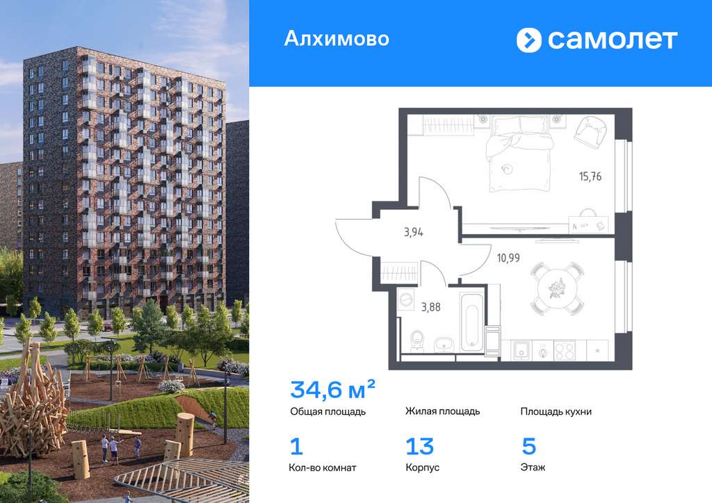 Строим кварталы для жизни с заботой о будущем. Предлагается 1-комнатная квартира комфорт-класса 34,6 кв. м в корпусе 13 на 5 этаже, в ЖК «Алхимово»