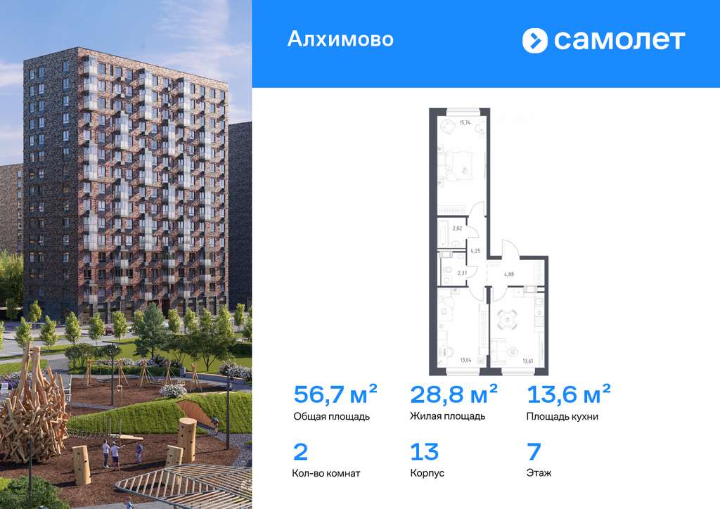 Строим кварталы для жизни с заботой о будущем. Предлагается 2-комнатная квартира комфорт-класса 56,7 кв. м в корпусе 13 на 7 этаже, в ЖК «Алхимово»