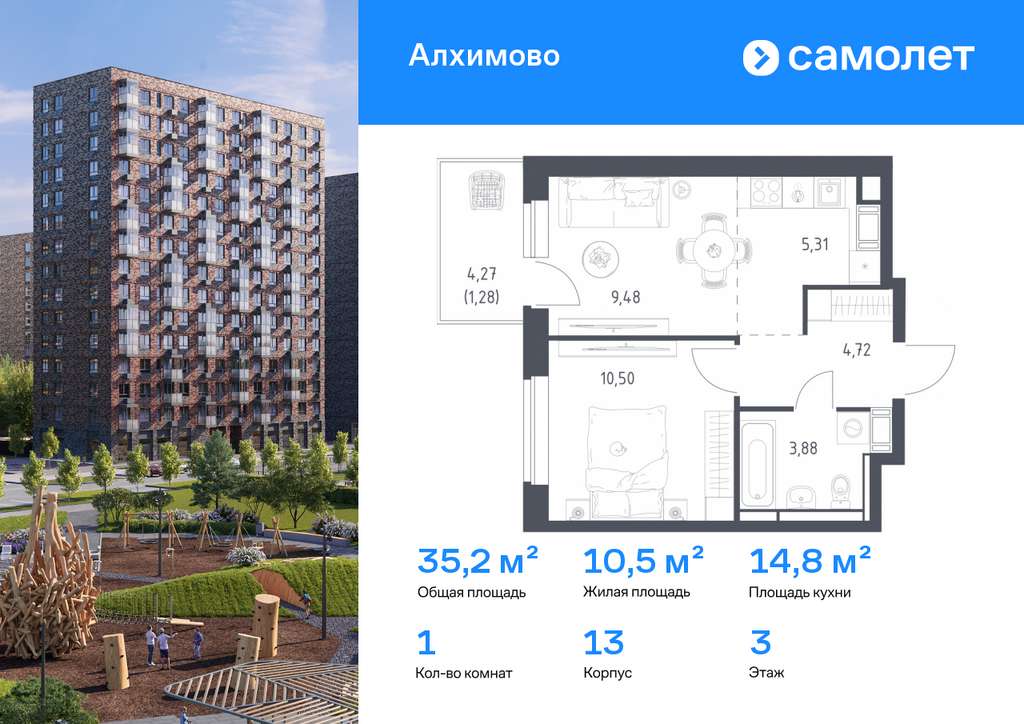 Строим кварталы для жизни с заботой о будущем. Предлагается 1-комнатная квартира комфорт-класса 35,2 кв. м в корпусе 13 на 3 этаже, в ЖК «Алхимово»
