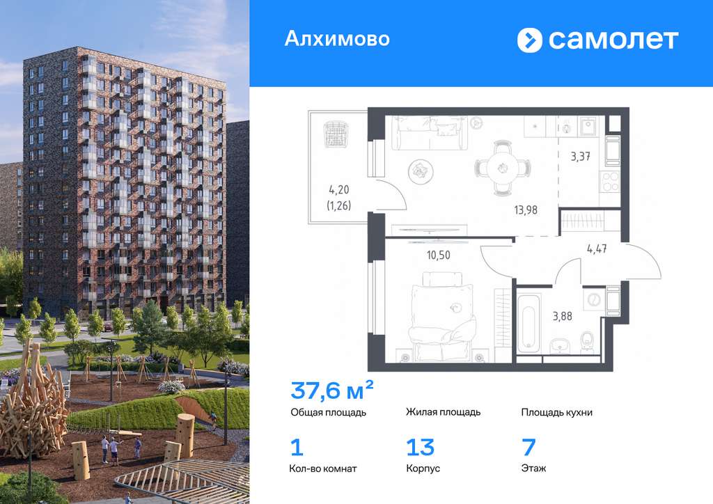 Строим кварталы для жизни с заботой о будущем. Предлагается 1-комнатная квартира комфорт-класса 37,6 кв. м в корпусе 13 на 7 этаже, в ЖК «Алхимово»