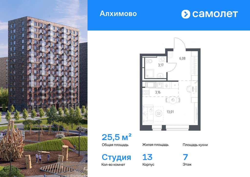 Строим кварталы для жизни с заботой о будущем. Предлагается квартира студия комфорт-класса 25,5 кв. м в корпусе 13 на 7 этаже, в ЖК «Алхимово»