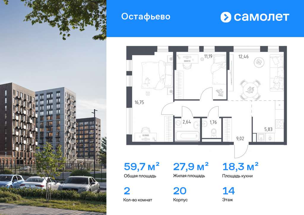 Строим кварталы для жизни с заботой о будущем. Предлагается 2-комнатная квартира комфорт-класса 59,65 кв. м в корпусе 20 на 14 этаже, в ЖК «Остафьево»