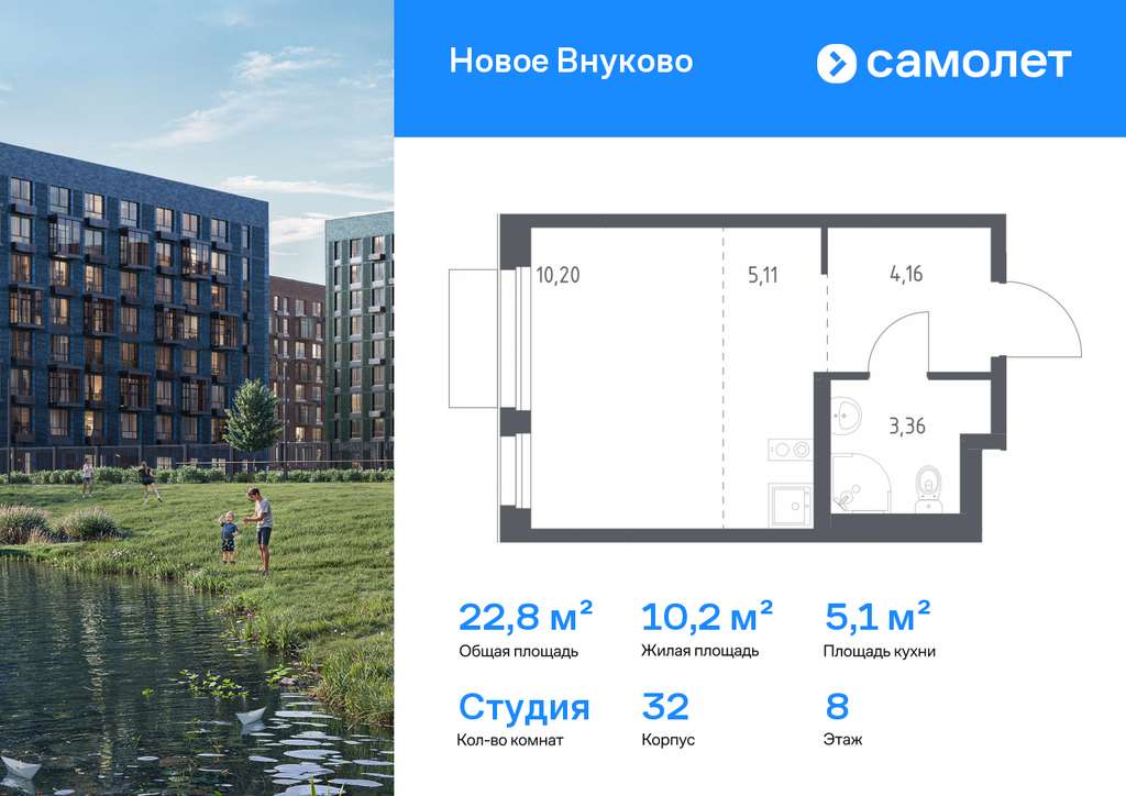 Строим кварталы для жизни с заботой о будущем. Предлагается квартира студия комфорт-класса 22,83 кв. м в корпусе 32 на 8 этаже, в ЖК «Новое Внуково»