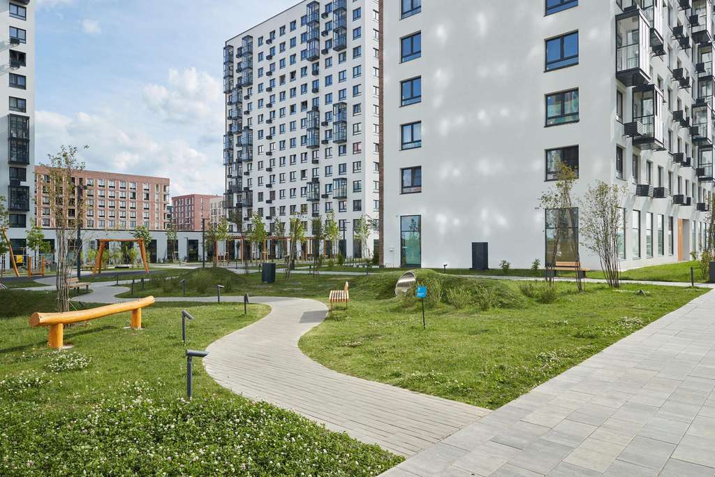 Дворы-парки закрыты от машин и посторонних. На территории — прогулочный маршрут вдоль реки Незнайка и набережная с шезлонгами и качелями для отдыха. Также здесь появится плейхаб «Незнайка на Луне», площадь для мероприятий с сухим фонтаном, летним кинотеатром и кафе.