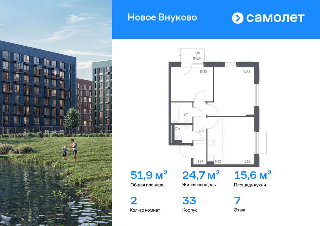 Строим кварталы для жизни с заботой о будущем. Предлагается 2-комнатная квартира комфорт-класса 51,89 кв. м в корпусе 33 на 7 этаже, в ЖК «Новое Внуково»