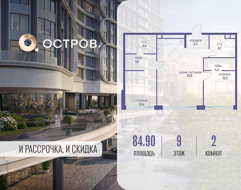 Продаётся 2-комн. квартира от застройщика: общая площадь 84.90 м, жилая 24.90 м, кухня 33.50 м, 9-й этаж, жилой квартал «Остров 7», корпус 6 (секция 1) . Срок сдачи: 3 квартал 2028 года.