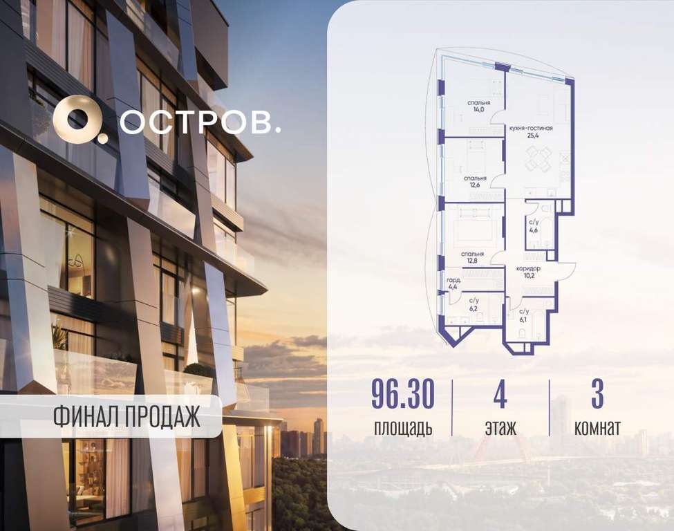 Продаётся 3-комн. квартира от застройщика: общая площадь 96.30 м, жилая 39.40 м, кухня 25.40 м, 4-й этаж, жилой квартал «Остров 12», корпус 4 (секция 1) . Срок сдачи: 1 квартал 2029 года.