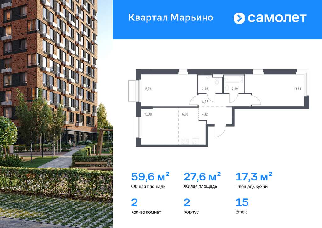 Строим кварталы для жизни с заботой о будущем. Предлагается 2-комнатная квартира комфорт-класса 59,6 кв. м в корпусе 2 на 15 этаже, в ЖК «Квартал Марьино»