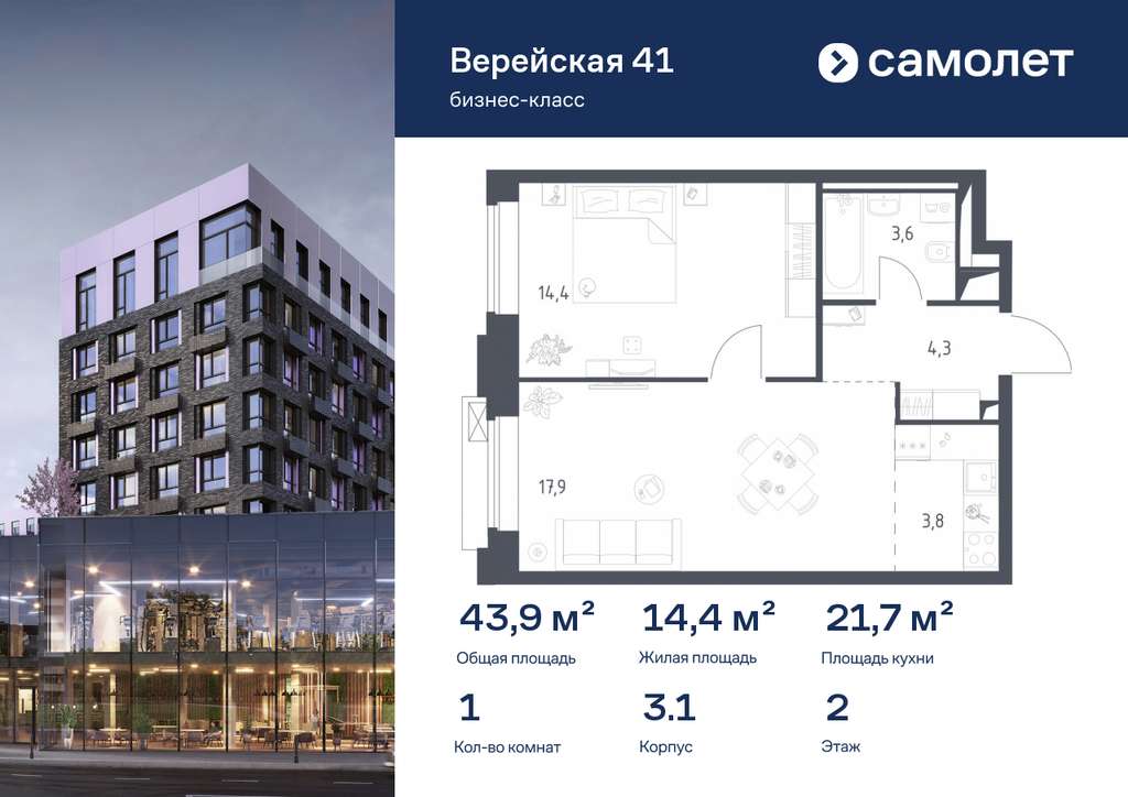 Строим кварталы для жизни с заботой о будущем. Предлагается 1-комнатная квартира бизнес-класса 43,91 кв. м в корпусе 3.1 на 2 этаже, в «Верейская 41»