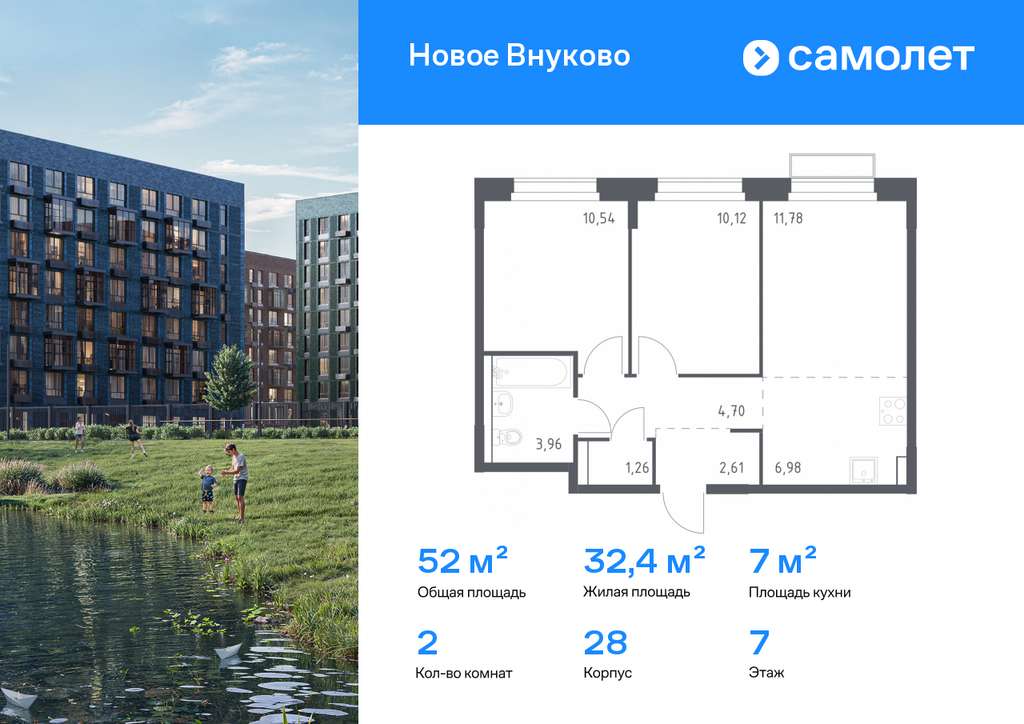 Строим кварталы для жизни с заботой о будущем. Предлагается 2-комнатная квартира комфорт-класса 51,95 кв. м в корпусе 28 на 7 этаже, в ЖК «Новое Внуково»