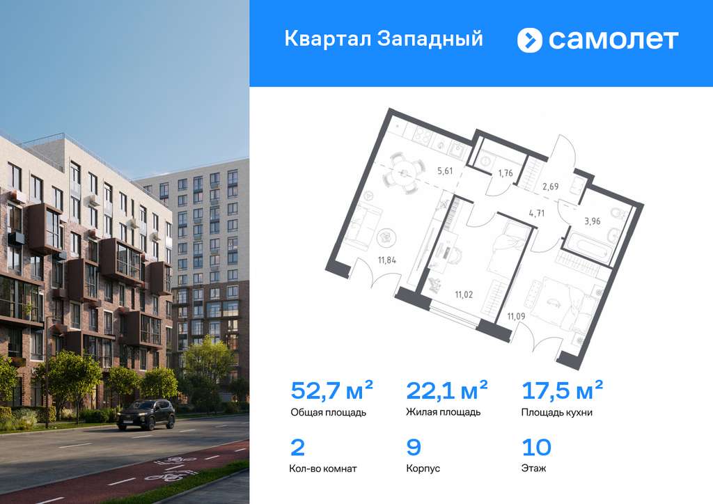 Строим кварталы для жизни с заботой о будущем. Предлагается 2-комнатная квартира комфорт-класса 52,68 кв. м в корпусе 9 на 10 этаже, в ЖК «Квартал Западный»
