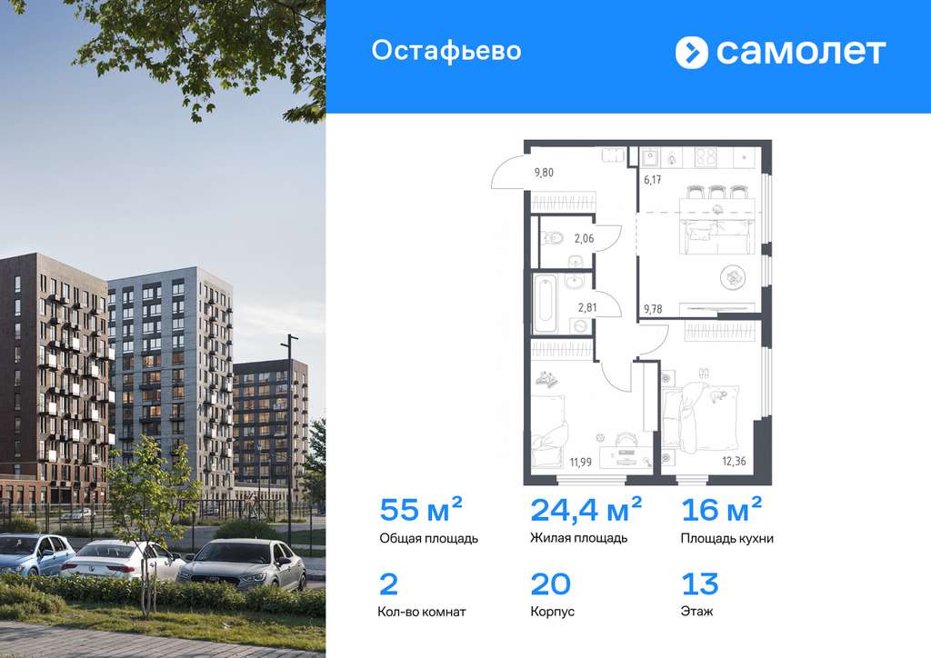 Строим кварталы для жизни с заботой о будущем. Предлагается 2-комнатная квартира комфорт-класса 54,97 кв. м в корпусе 20 на 13 этаже, в ЖК «Остафьево»