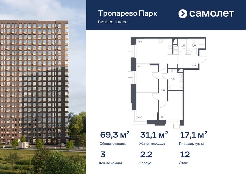 Строим кварталы для жизни с заботой о будущем. Предлагаются 3-комнатные апартаменты бизнес-класса 69,27 кв. м в корпусе 2.2 на 12 этаже, в МФК «Тропарево Парк»