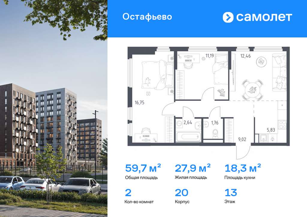 Строим кварталы для жизни с заботой о будущем. Предлагается 2-комнатная квартира комфорт-класса 59,65 кв. м в корпусе 20 на 13 этаже, в ЖК «Остафьево»
