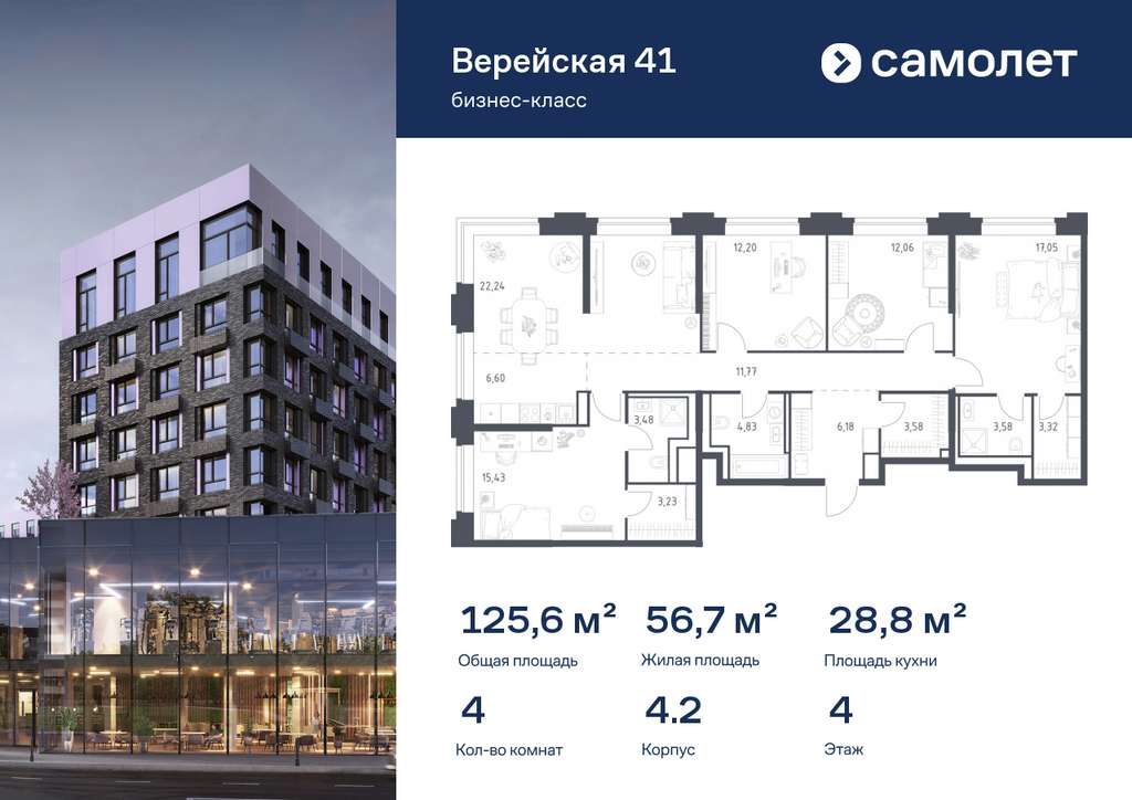 Строим кварталы для жизни с заботой о будущем. Предлагается 4-комнатная квартира бизнес-класса 125,55 кв. м в корпусе 4.2 на 4 этаже, в «Верейская 41»