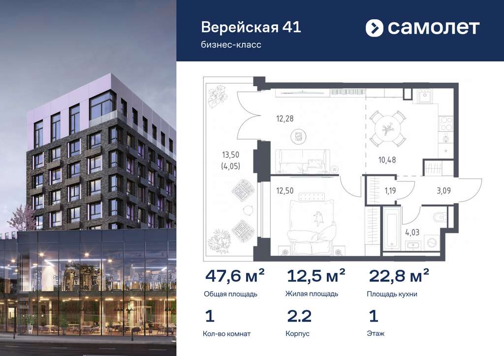 Строим кварталы для жизни с заботой о будущем. Предлагается 1-комнатная квартира бизнес-класса 47,62 кв. м в корпусе 2.2 на 1 этаже, в «Верейская 41»