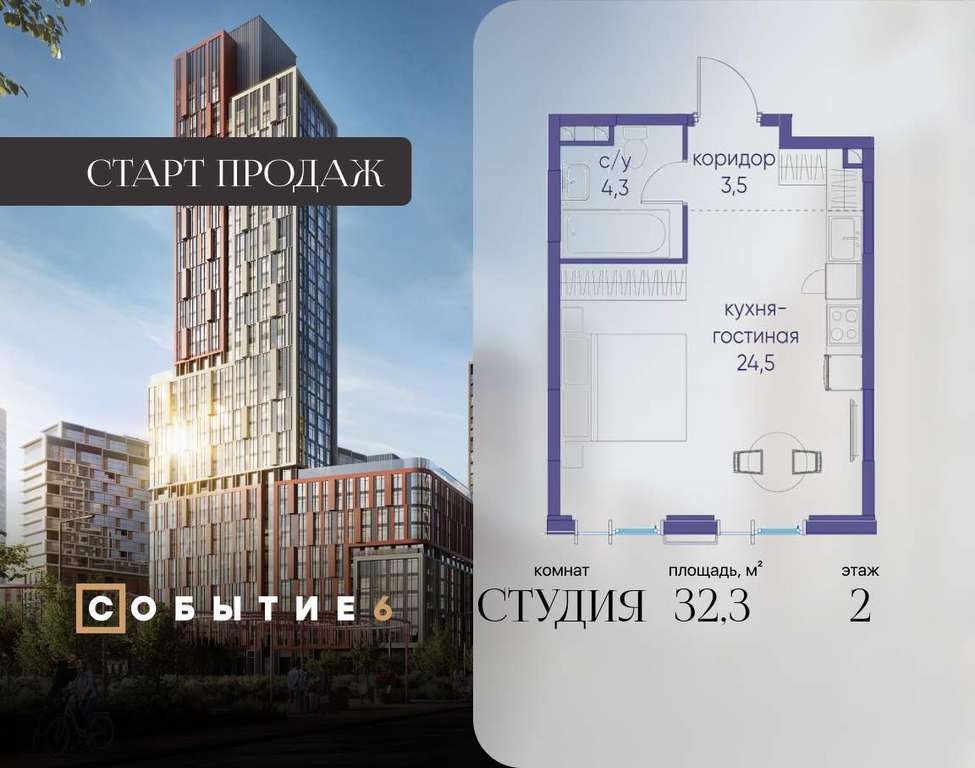 Продаётся квартира-студия от застройщика: общая площадь 32.30 м, жилая 19.50 м, кухня 5.00 м, 2-й этаж, жилой квартал «Событие-6», корпус 2 (секция 4) Срок сдачи: 1 квартал 2029 года.