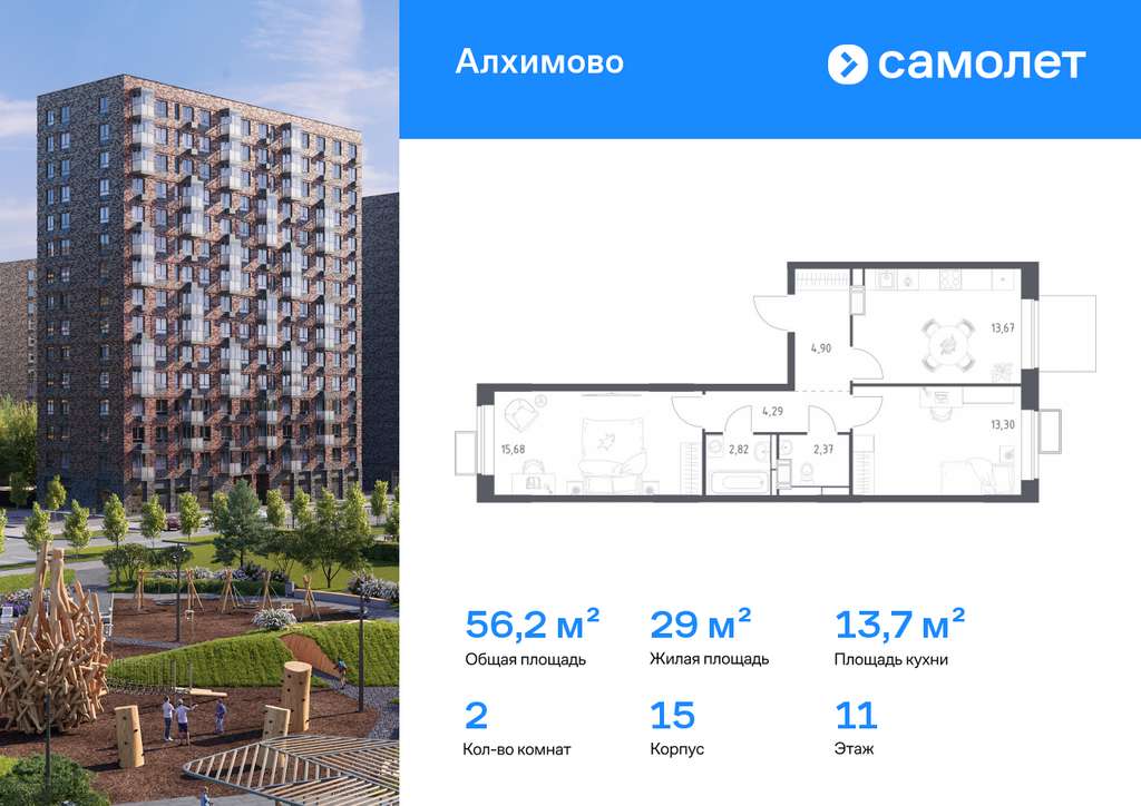 Строим кварталы для жизни с заботой о будущем. Предлагается 2-комнатная квартира комфорт-класса 56,2 кв. м в корпусе 15 на 11 этаже, в ЖК «Алхимово»