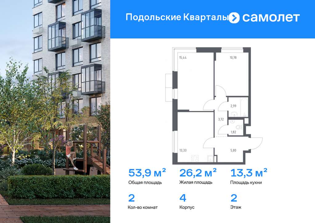 Строим кварталы для жизни с заботой о будущем. Предлагается 2-комнатная квартира комфорт-класса 53,88 кв. м в корпусе 4 на 2 этаже, в ЖК «Подольские Кварталы»