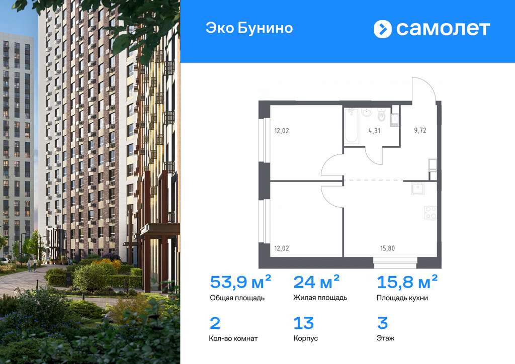 Строим кварталы для жизни с заботой о будущем. Предлагается 2-комнатная квартира комфорт-класса 53,87 кв. м в корпусе 13 на 3 этаже, в ЖК «Эко Бунино»
