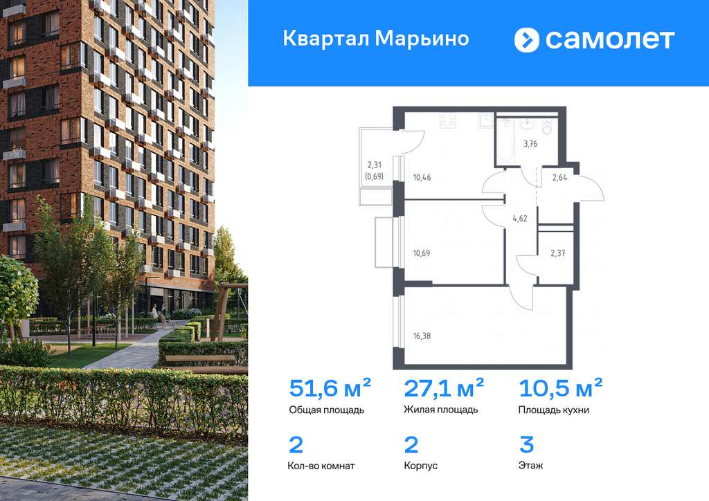 Строим кварталы для жизни с заботой о будущем. Предлагается 2-комнатная квартира комфорт-класса 51,61 кв. м в корпусе 2 на 3 этаже, в ЖК «Квартал Марьино»