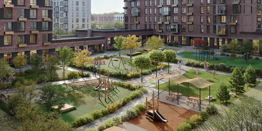 В закрытых дворах-парках предусмотрены игровые площадки, лужайки для пикников и йоги. Пространства для спокойного отдыха будут огорожены живыми изгородями.