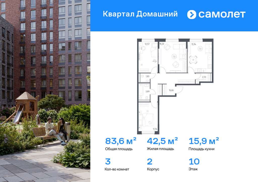 Строим кварталы для жизни с заботой о будущем. Предлагается 3-комнатная квартира комфорт-класса 83,58 кв. м в корпусе 2 на 10 этаже, в ЖК «Квартал Домашний»