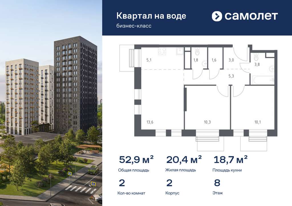 Строим кварталы для жизни с заботой о будущем. Предлагается 2-комнатная квартира бизнес-класса 52,9 кв. м в корпусе 2 на 8 этаже, в ЖК «Квартал на воде»