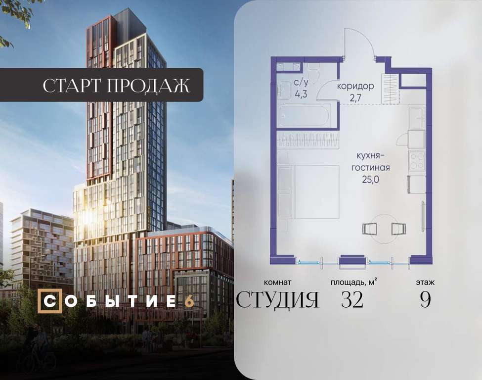 Продаётся квартира-студия от застройщика: общая площадь 32.00 м, жилая 20.00 м, кухня 5.00 м, 9-й этаж, жилой квартал «Событие-6», корпус 2 (секция 4) Срок сдачи: 1 квартал 2029 года.
