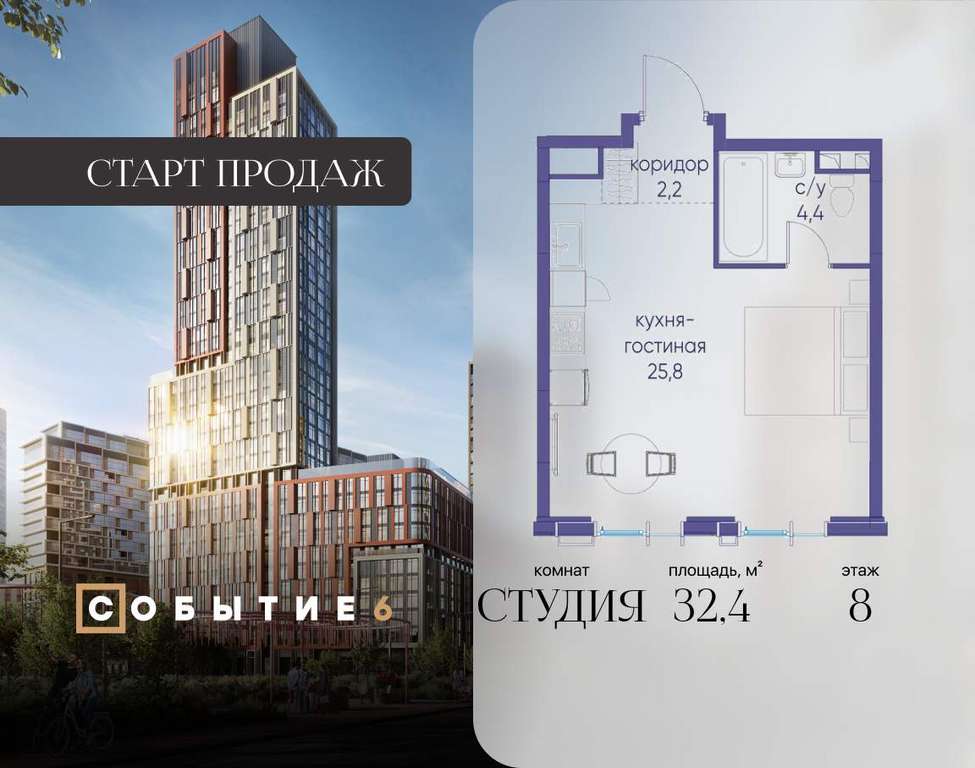 Продаётся квартира-студия от застройщика: общая площадь 32.40 м, жилая 20.80 м, кухня 5.00 м, 8-й этаж, жилой квартал «Событие-6», корпус 2 (секция 4) Срок сдачи: 1 квартал 2029 года.