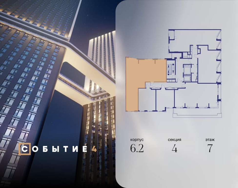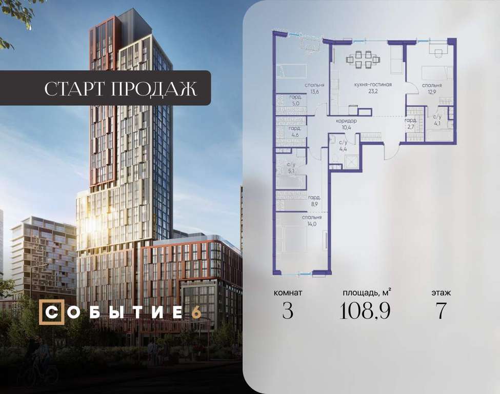 Продаётся 3-комнатная квартира от застройщика: общая площадь 108.90 м, жилая 40.50 м, кухня 23.20 м, 7-й этаж, жилой квартал «Событие-6», корпус 2 (секция 4) Срок сдачи: 1 квартал 2029 года.