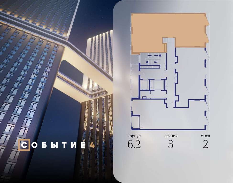 Продаётся 3-комнатная квартира от застройщика: общая площадь 104.50 м, жилая 43.70 м, кухня 29.00 м, 2-й этаж, жилой квартал «Событие-6», корпус 2 (секция 3) Срок сдачи: 1 квартал 2029 года.