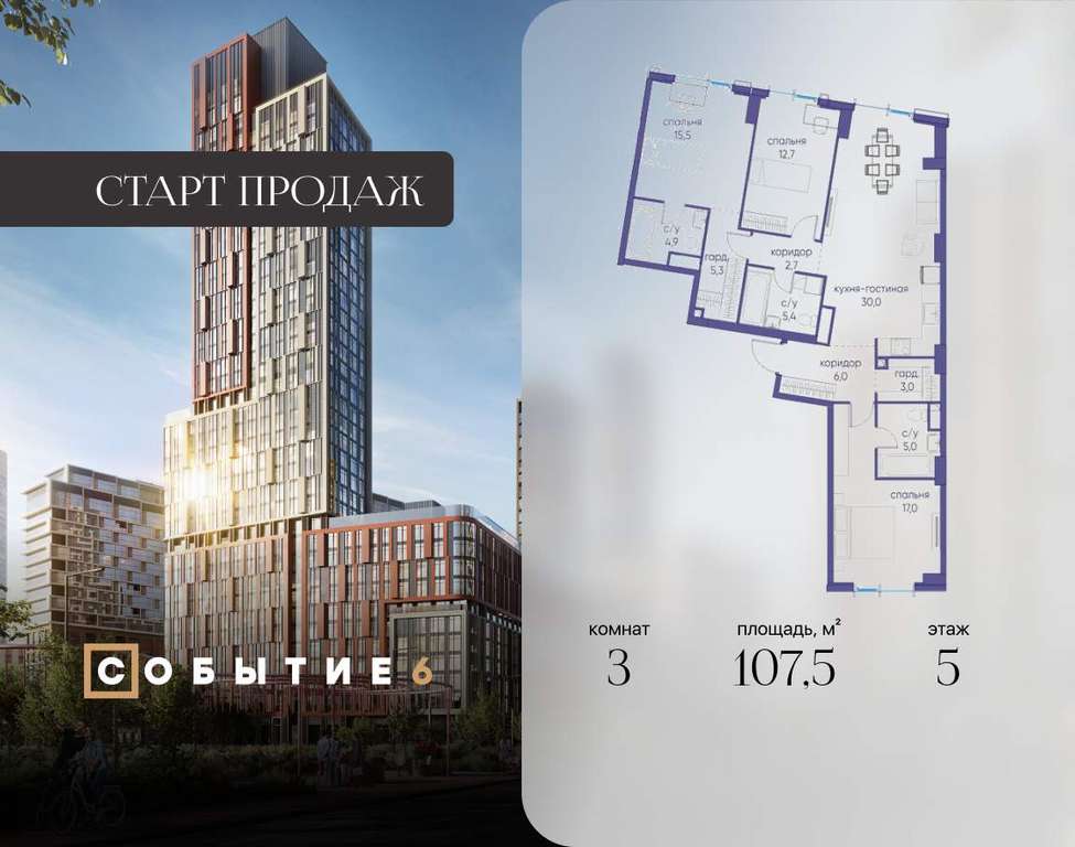 Продаётся 3-комнатная квартира от застройщика: общая площадь 107.50 м, жилая 35.20 м, кухня 30.00 м, 5-й этаж, жилой квартал «Событие-6», корпус 2 (секция 5) Срок сдачи: 1 квартал 2029 года.