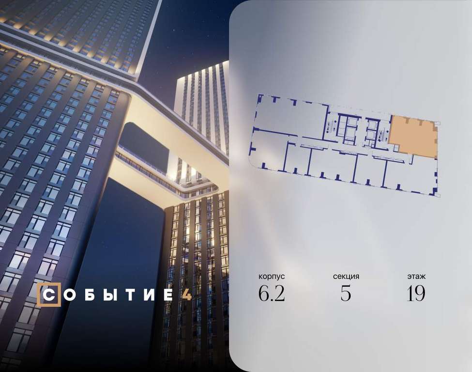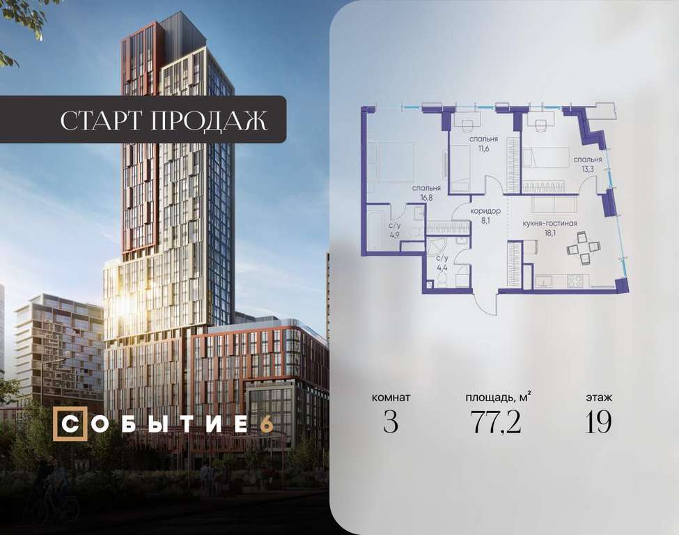 Продаётся 3-комнатная квартира от застройщика: общая площадь 77.20 м, жилая 41.70 м, кухня 18.10 м, 19-й этаж, жилой квартал «Событие-6», корпус 2 (секция 5) Срок сдачи: 1 квартал 2029 года.