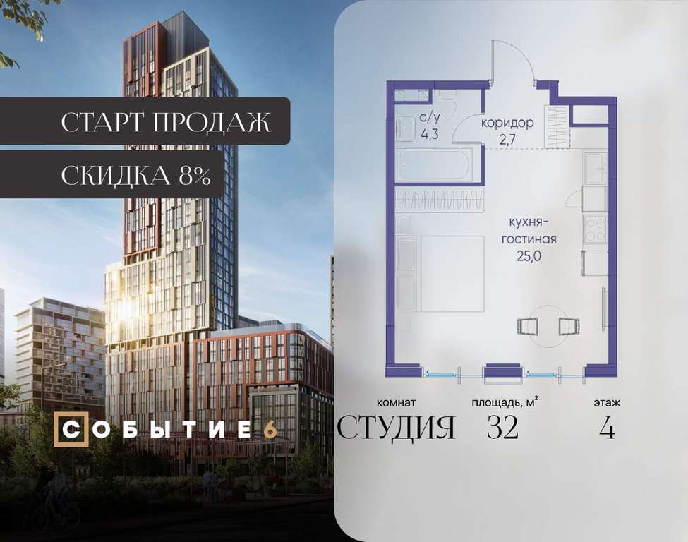Продаётся квартира-студия от застройщика: общая площадь 32.00 м, жилая 20.00 м, кухня 5.00 м, 4-й этаж, жилой квартал «Событие-6», корпус 2 (секция 4) Срок сдачи: 1 квартал 2029 года.
