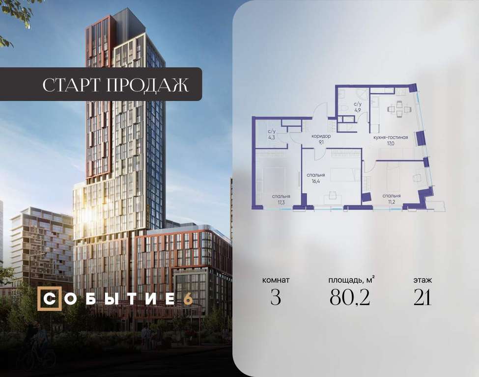 Продаётся 3-комнатная квартира от застройщика: общая площадь 80.20 м, жилая 44.90 м, кухня 17.00 м, 21-й этаж, жилой квартал «Событие-6», корпус 2 (секция 5) Срок сдачи: 1 квартал 2029 года.
