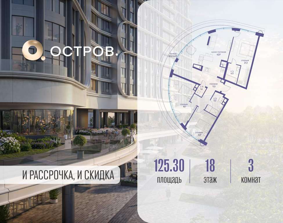 Продаётся 3-комн. квартира от застройщика: общая площадь 125.30 м, жилая 53.90 м, кухня 42.90 м, 18-й этаж, жилой квартал «Остров 7», корпус 7 (секция 1) . Срок сдачи: 3 квартал 2028 года.