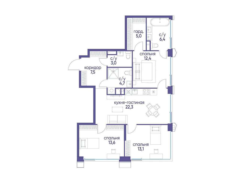 Продаётся 3-комн. квартира от застройщика: общая площадь 88.00 м, жилая 39.10 м, кухня 22.30 м, 12-й этаж, жилой квартал «Остров 12», корпус 3 (секция 1) . Срок сдачи: 1 квартал 2029 года.