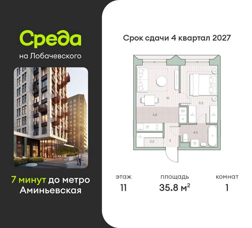 Квартира располагается на 11 этаже 13-этажного дома в ЖК Среда на Лобачевского.