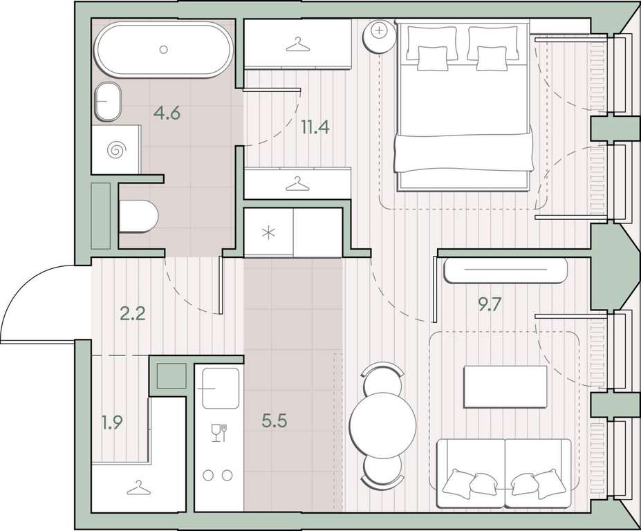Жилая площадь 21.1 м2, кухня 5.5 м2, предчистовая отделка, комнаты изолированные.
