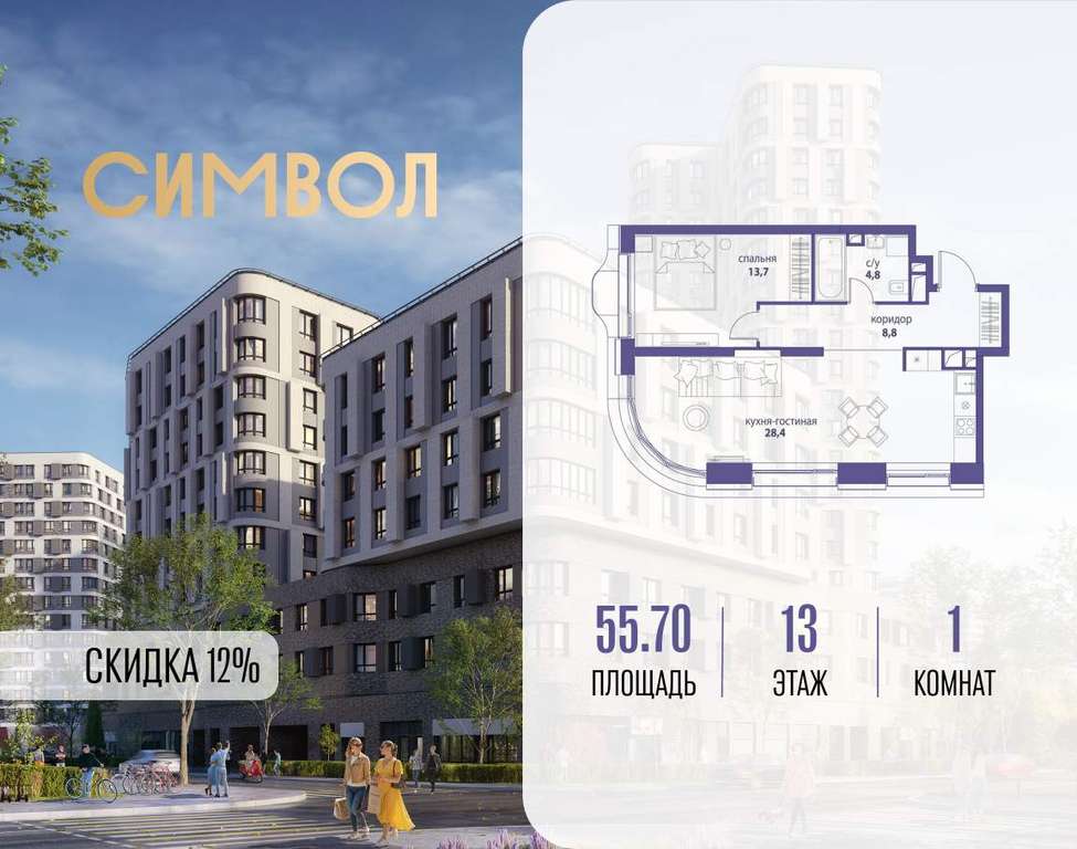 Продается 1-комнатная квартира от застройщика: общая площадь 55.70 м, жилая 13.70 м, кухня 28.40 м, 13-й этаж, жилой квартал «Вдохновение», корпус 35 (секция 1) . Срок сдачи: 4 квартал 2027 года.
