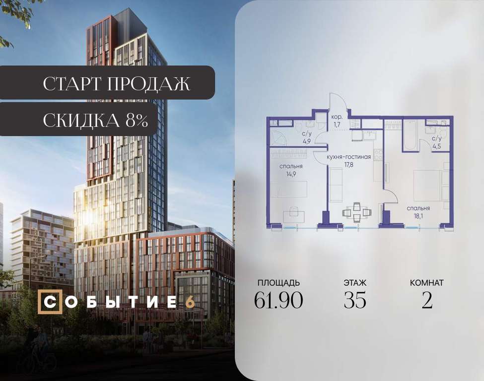 Продаётся 2-комнатная квартира от застройщика: общая площадь 61.90 м, жилая 33.00 м, кухня 17.80 м, 35-й этаж, жилой квартал «Событие-6», корпус 2 (секция 5) Срок сдачи: 1 квартал 2029 года.