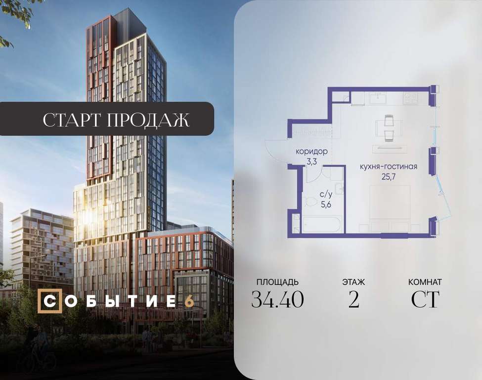 Продаётся квартира-студия от застройщика: общая площадь 34.40 м, жилая 20.70 м, кухня 5.00 м, 2-й этаж, жилой квартал «Событие-6», корпус 2 (секция 2) Срок сдачи: 1 квартал 2029 года.