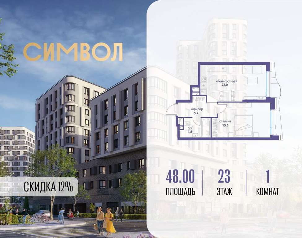 Продается 1-комнатная квартира от застройщика: общая площадь 48.00 м, жилая 15.50 м, кухня 22.00 м, 23-й этаж, жилой квартал «Вдохновение», корпус 34 (секция 1) . Срок сдачи: 4 квартал 2027 года.