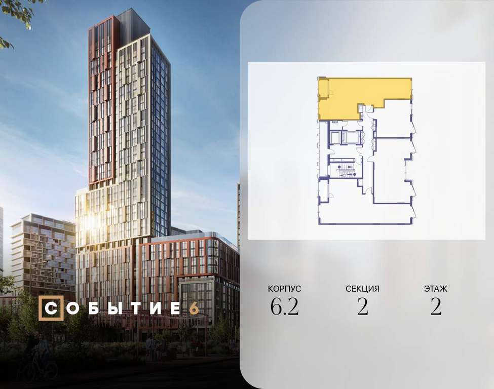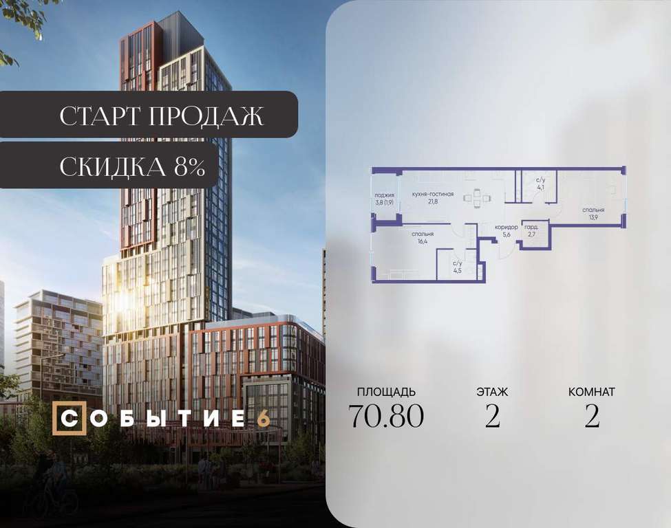 Продаётся 2-комнатная квартира от застройщика: общая площадь 70.80 м, жилая 30.30 м, кухня 21.80 м, 2-й этаж, жилой квартал «Событие-6», корпус 2 (секция 2) Срок сдачи: 1 квартал 2029 года.