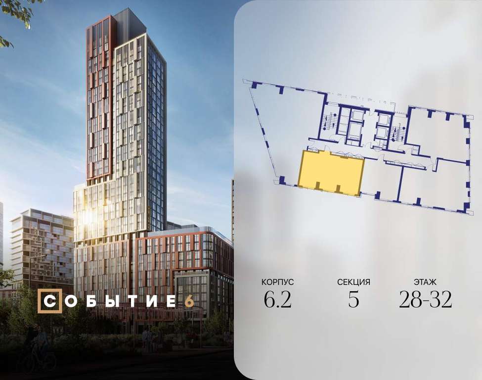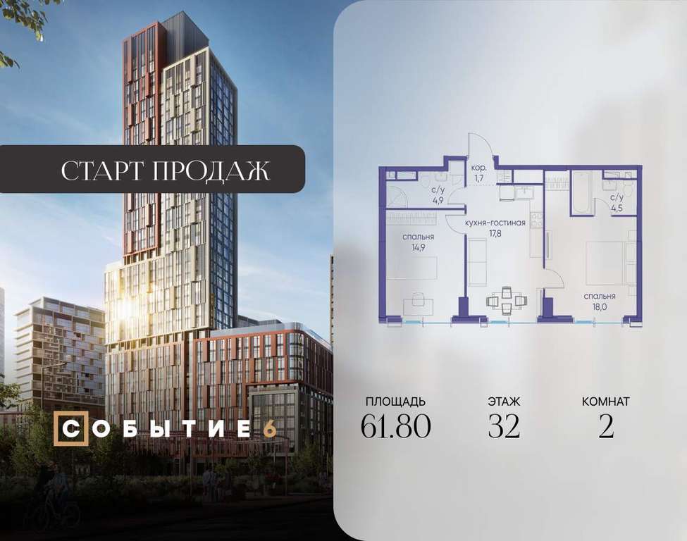 Продаётся 2-комнатная квартира от застройщика: общая площадь 61.80 м, жилая 32.90 м, кухня 17.80 м, 32-й этаж, жилой квартал «Событие-6», корпус 2 (секция 5) Срок сдачи: 1 квартал 2029 года.