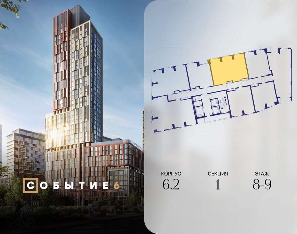 Продаётся 2-комнатная квартира от застройщика: общая площадь 72.20 м, жилая 30.80 м, кухня 24.40 м, 9-й этаж, жилой квартал «Событие-6», корпус 2 (секция 1) Срок сдачи: 1 квартал 2029 года.