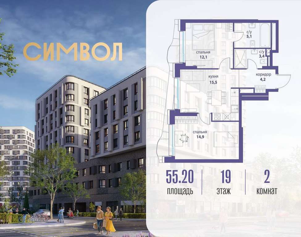 Продается 2-комнатная квартира от застройщика: общая площадь 55.20 м, жилая 27.00 м, кухня 15.50 м, 19-й этаж, жилой квартал «Вдохновение», корпус 34 (секция 1) . Срок сдачи: 4 квартал 2027 года.