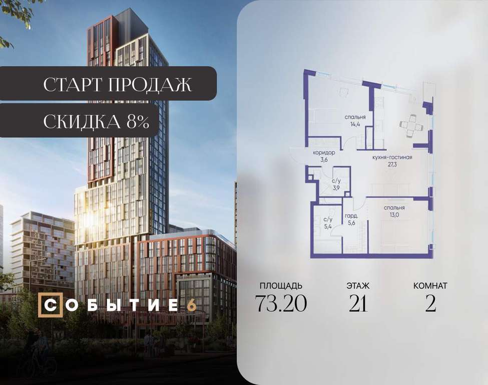 Продаётся 2-комнатная квартира от застройщика: общая площадь 73.20 м, жилая 27.40 м, кухня 27.30 м, 21-й этаж, жилой квартал «Событие-6», корпус 2 (секция 1) Срок сдачи: 1 квартал 2029 года.