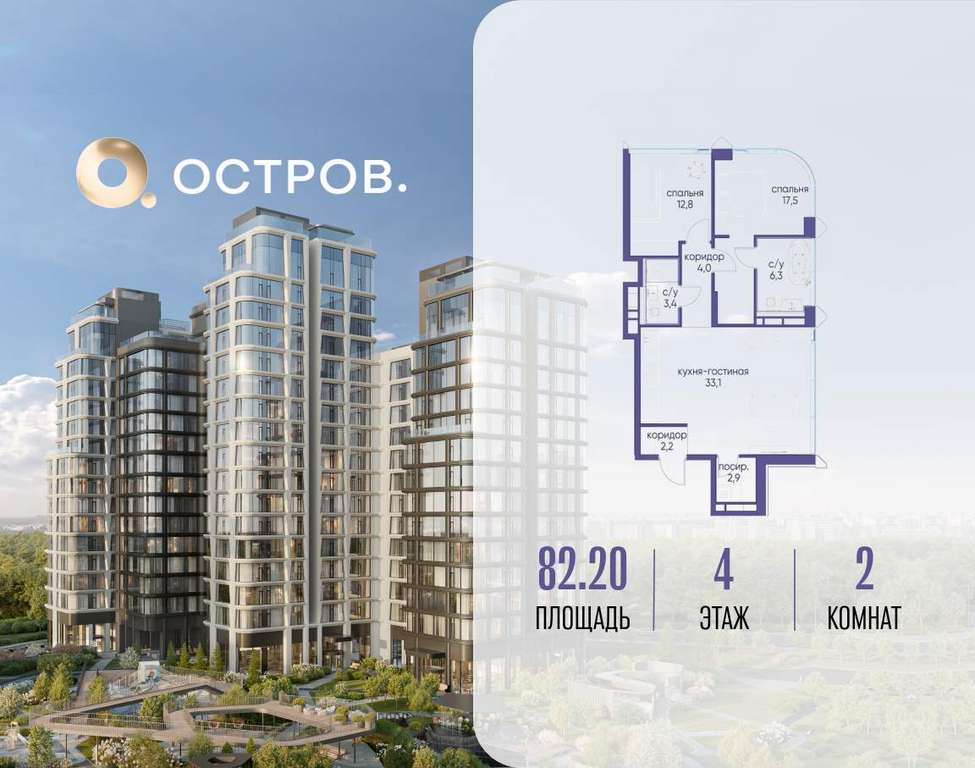 Продаётся 2-комн. квартира от застройщика: общая площадь 82.20 м, жилая 30.30 м, кухня 33.10 м, 4-й этаж, жилой квартал «Остров 12», корпус 2 (секция 2) . Срок сдачи: 1 квартал 2029 года.